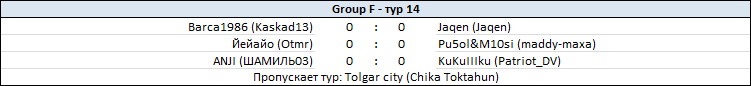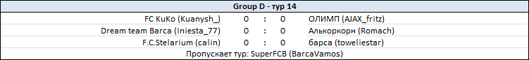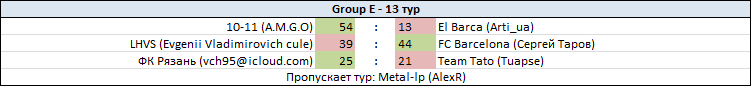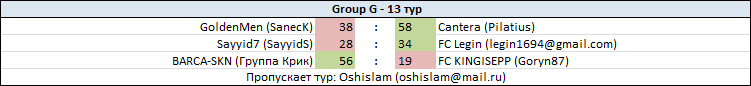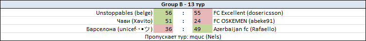 Но для начала, как обычно, мы взглянем на результаты 13-го тура нашего турнира, узнаем соперников в 14-м, и конечно, посмотрим на таблички. Кстати, жирным шрифтом в них выделены команды, обеспечившие себе выход дальше (лишь выход, а не занятое место), а серым - команды, лишившиеся шансов пройти во второй раунд.