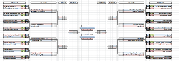Привет друзья! Довольно быстро и совершенно неожиданно проскочил первый раунд плей-офф нашего фэнтези-турнира... Из борьбы за главный трофей стали выпадать сильные и конкурентоспособные команды.Кто-то потерпел неудачу в упорной борьбе, кто-то что называется "слил". В любом случае, призываю всех не бросать всё на произвол судьбы, а продолжать бороться за победу в общем зачёте лиги Барса.ру. А всем кто прошёл дальше - желаем удачи! Пары на стадии 1/8 получились очень интересными и ровными.