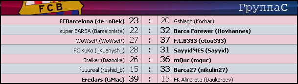 - +24 - группа C - Eredars (GMac) - FK Alma-ata (Daukaraev) 39 : 15