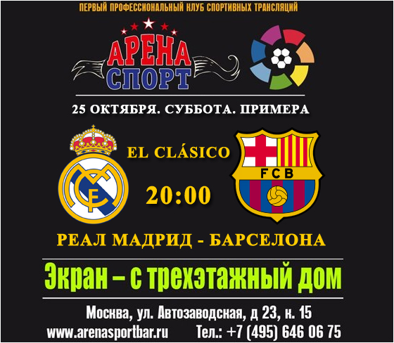 25 октября будет организован совместный просмотр первого Эль Класико сезона на самом большом экране Москвы. Болельщиков "Барселоны" в этот день примет заведение "Арена Спорт".