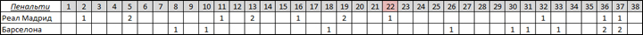 Начнем с самого интересного. После выделенного 22-го тура отрыв Реала возрос до максимальных в прошедшем сезоне десяти очков. В этих самых 22-х стартовых турах Реалу назначали десять пенальти, в то время как Барселоне всего три. Зато в последних девяти турах в ворота соперников Барсы было назначено аж семь пенальти.