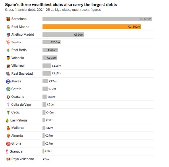 Финансовая задолженность команд Ла Лиги. Разница между нами и финансовым "гением" Пересом, практически минимальна. |