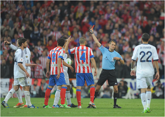 Ближе к концу матча с поля был удален Криштиану Роналду. Еще в дополнительные минуты к основному времени матча португалец вышел из себя и безнаказанно совершил несколько грязных приемов. В этот же раз арбитр был беспощаден. Также он удалил тренера "Реала" Жозе Моуринью и полузащитника "Атлетико" Габи.