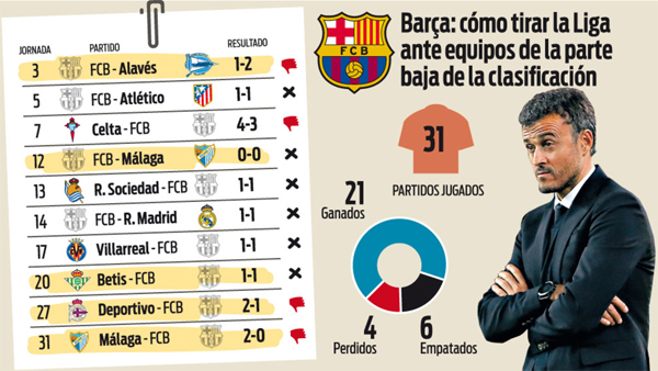 Подобный парадокс особенно больно воспринимается семьей барселонистов, ведь сейчас команда в шаге от пропасти в своих претензиях на чемпионство в Ла Лиге. Мы видим прекрасные матчи и выступления против намного более серьезных оппонентов ("Севилья", "Сельта", "Атлетико Мадрид"...), однако испытываем глубокое разочарование, когда оными являются команды из нижней части турнирной таблицы ("Алавес", "Малага", "Бетис", "Депортиво"...).